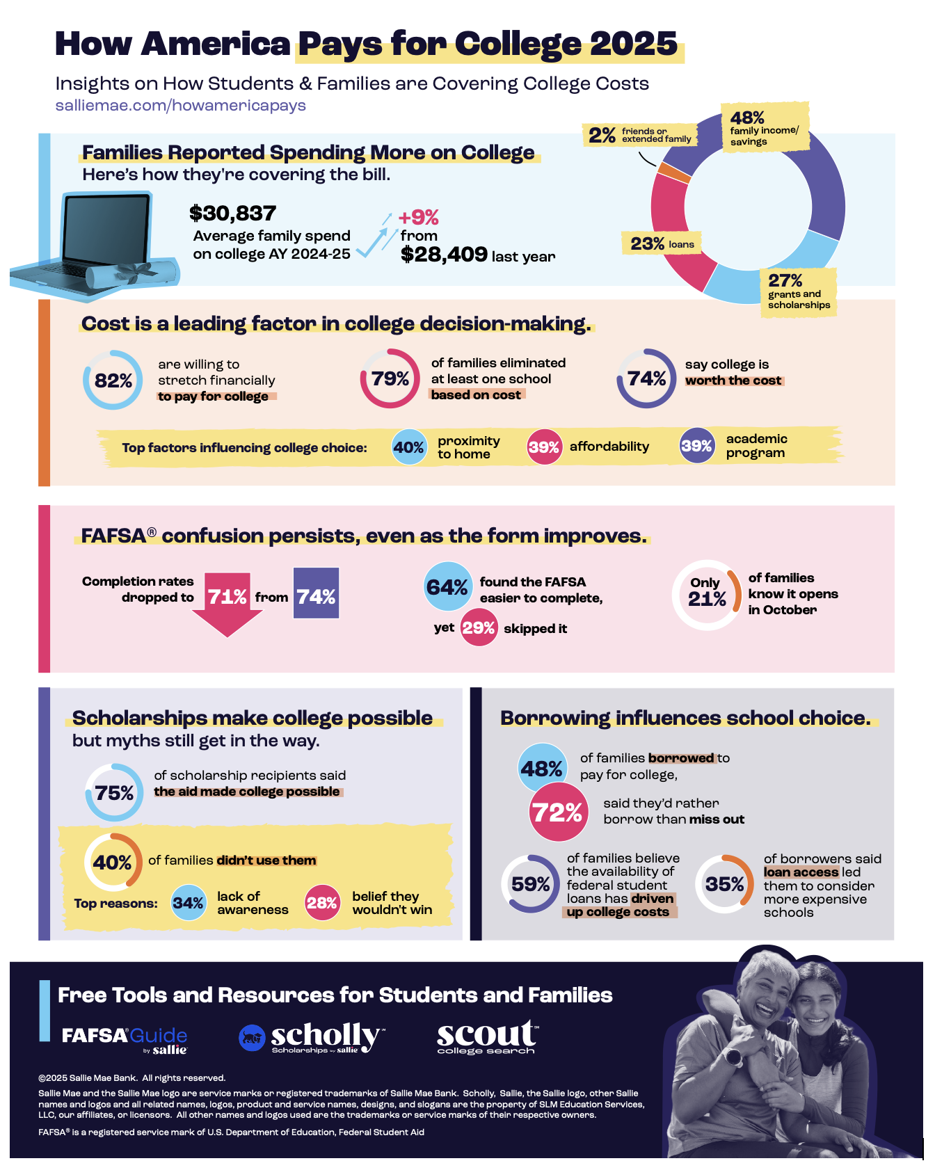 Families reported spending an average of $30,837 on college during the 2024–25 academic year—up 9% from $28,409 last year and a return to pre-pandemic spending levels, according to “How America Pays for College 2025,” the annual study by Sallie Mae and Ipsos. Family income and savings covered nearly half of costs (48%), followed by scholarships and grants (27%), borrowing (23%), and contributions from family or friends (2%).